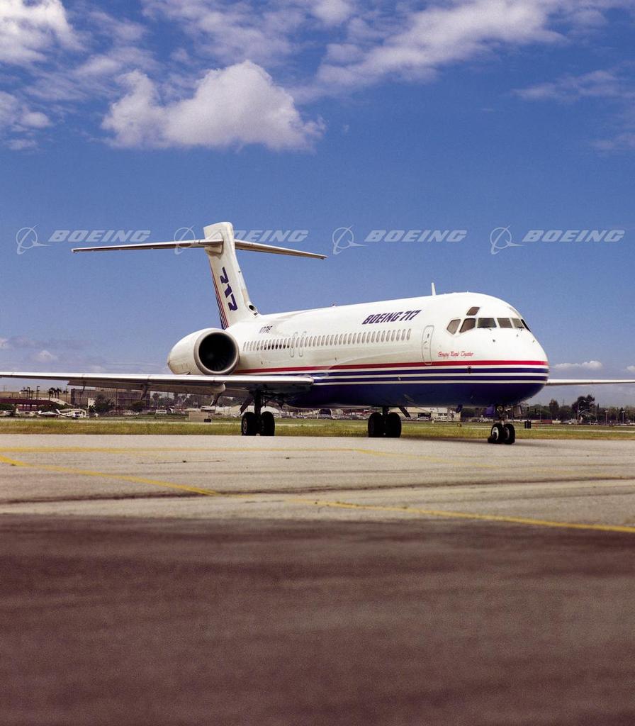 Fresh from the paint hangar in Long Beach, CA, this Boeing 717-200 is being prepared for a busy flight schedule at the Paris Air Show in June 1999 to be followed by a 10-day marketing tour of European cities. Boeing will host airline guests on demonstration flights and at static displays in as many as 16 cities.