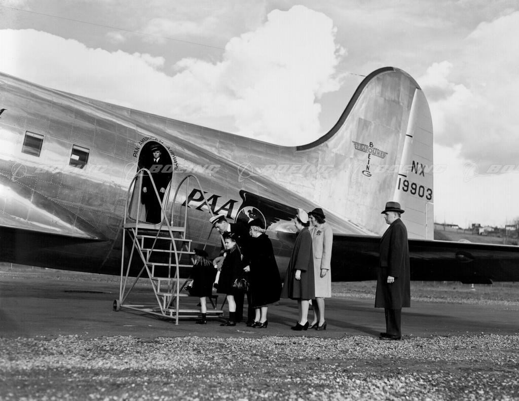 Passengers boarding Pan American Airways 307 Stratoliner (NX19903) from Boeing News, March 1940, page 2. The Boeing Model 307 Stratoliner was the world's first high-altitude commercial transport and the first four-engine airliner in scheduled domestic service.