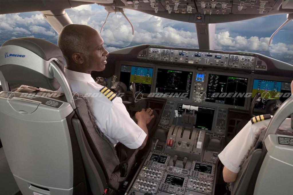 The all-new Boeing 787 Dreamliner flight deck features new technologies while retaining significant operational similarity with the popular Boeing 777 and other Boeing jets. The combination provides operational improvements and cost-saving commonality. The new flight deck features much larger display screens than previously seen in airplanes. Other key features are the dual head-up displays (HUDs) and dual electronic flight bag. Boeing has offered HUDs and electronic flight bags on other aircraft models but with the 787 they are standard features. HUDs display information on clear screens mounted at eye level so the pilots can see flight data while looking out the windows. Electronic flight bags are the digital equivalent of the pilot's flight bag and include maps, charts, manuals and other data. Like the passenger cabin, the flight deck will feature unique styling that helps to create a pleasing atmosphere. And pilots will also enjoy the reduced maximum cabin altitude of 6,000 feet.