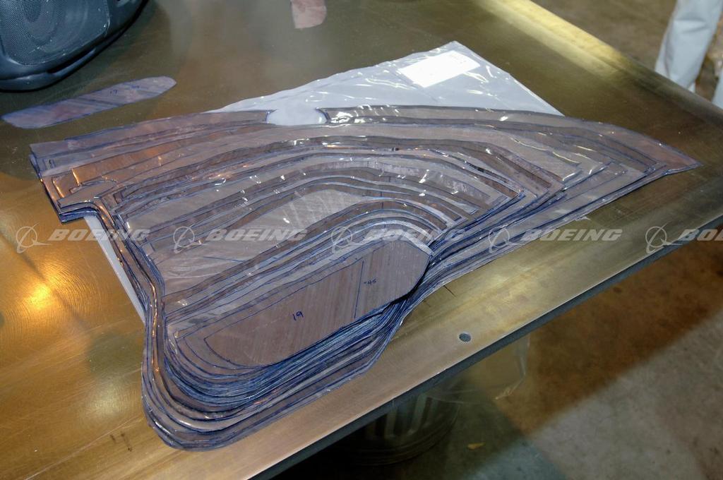 Pre-cut carbon fiber ply layers are stacked in preparation for the repair process at the Boeing composites manufacturing facility in Frederickson, Washington.