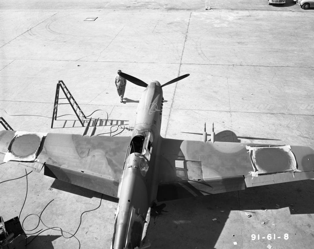 British markings being applied to an RAF Mustang 1a at North American Aviation plant in Los Angeles. At the request of the RAF, North American redesigned the Mustang to be armed with four 20mm in place of the original armament of .30 and .50 caliber machine guns. The new version was given the charge order number NA-91 and 150 were ordered for the RAF through lend lease. When the United States entered the war, 58 of the NA-91s were deferred to the USAAF where they were known as the P-51 Apache. (1942)