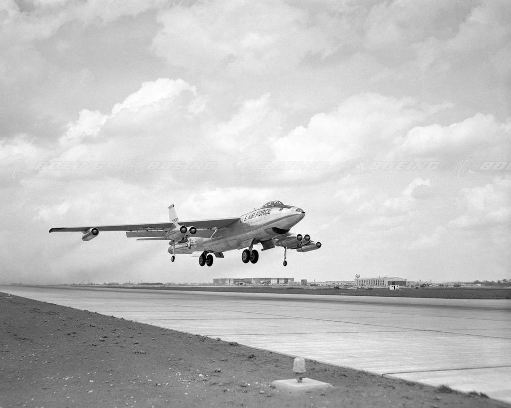 At the time of its first flight, Dec. 17, 1947, the B-47 Stratojet represented a radical departure from traditional design, and it set the design standards for all large jet aircraft until the present time. The six-engine Boeing B-47 was America's first multiengine swept-wing jet bomber. Its thin 116-foot wing was extraordinarily flexible and swept back at a 35-degree angle. Eighteen small rocket units in the fuselage provided jet-assisted takeoff (JATO), and parachutes cut its landing speeds. Later models were powered by 5,200-pound-thrust axial-flow jet engines, and top speeds were 600 mph. A total of 2,032 B-47s in all versions were built.