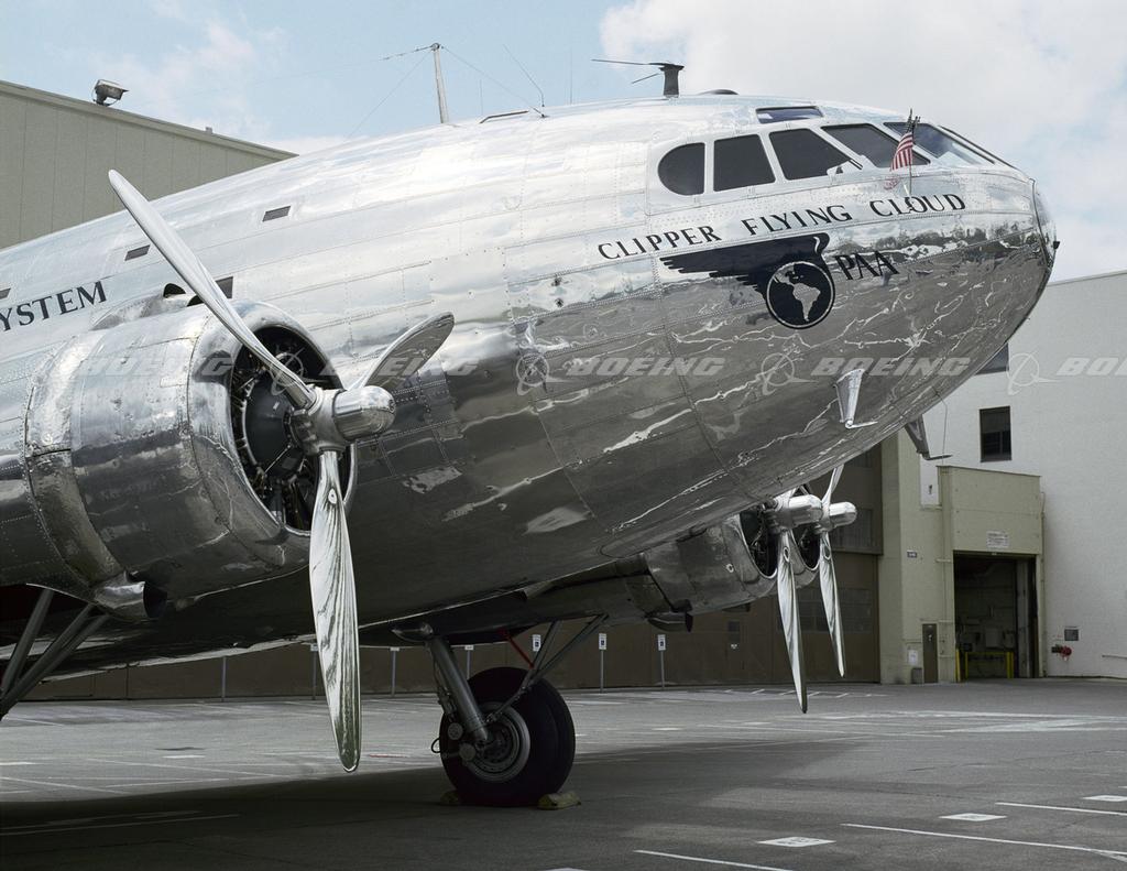 The Boeing Model 307 pressurized cabin allowed the airplane to soar (220 mph cruising speed) above rough weather at an altitude of 20,000 feet -- higher than any other transport of its time. With names like Rainbow, Comet, Flying Cloud and Apache, the Stratoliner set new standards for speed and comfort. The Boeing Model 307 circular fuselage provided maximum space for the five crew members and 33 passengers. The nearly 12-foot-wide cabin had space for comfortable berths for overnight travelers.