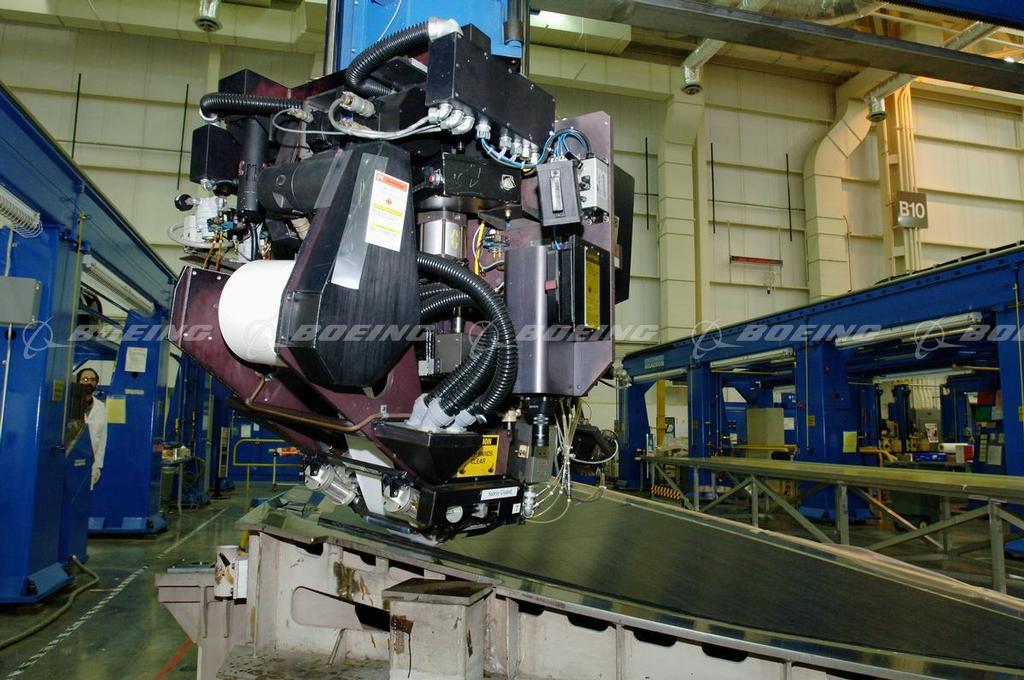 A robotic head assembly on an automatic tape lay-up machine is used to precisely lay carbon fiber ply layers on 777 vertical fin composite panels at the Boeing composites manufacturing facility in Frederickson, Washington.