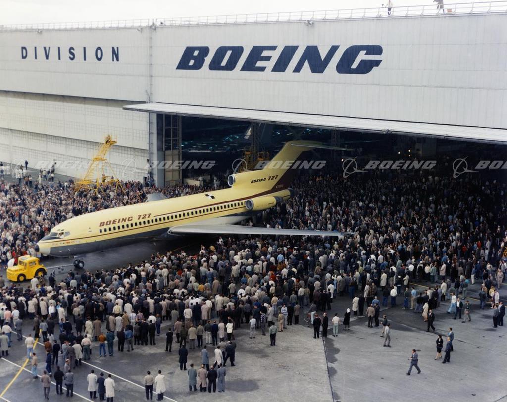The first 727 rolled out Nov. 27, 1962, bearing the same lemon-yellow and copper-brown color scheme as the Dash 80. However, by the time of its first flight, orders were still below the estimated break-even point of 200. To help spur sales, Boeing sent a 727 on a 76,000-mile tour of 26 countries. Originally, Boeing planned to build 250 of the planes. However, after being shown to the world, they proved so popular (especially after the larger 727-200 model, which carried up to 189 passengers, was introduced) that a total of 1,832 were produced at the Renton, Wash., plant. Variants included a convertible passenger-cargo model with a Quick Change (QC) option -- seats and galleys attached to removable pallets.