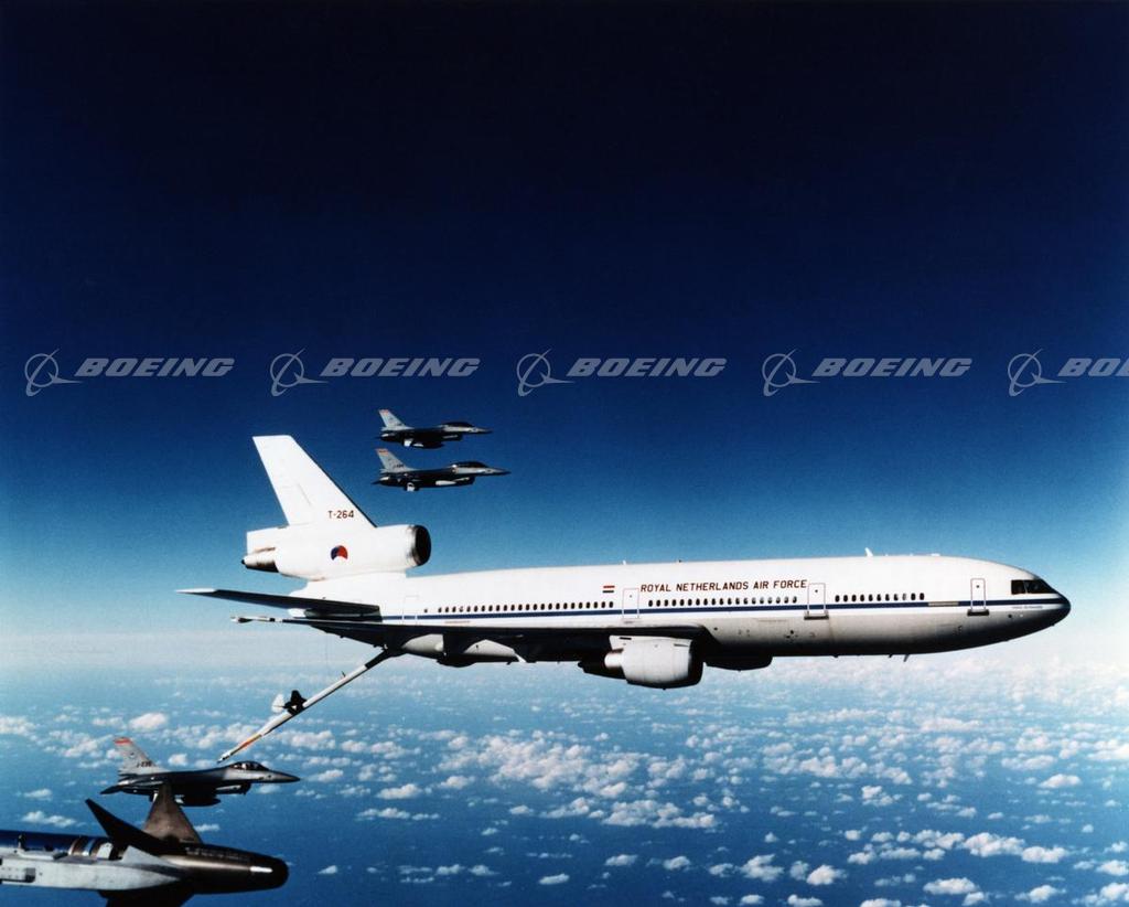 The KDC-10 is an advanced tanker/cargo aircraft designed to provide rapid, worldwide force projection for the armed services. Two DC-10-30-CFs underwent modification to become Royal Netherlands Air Force KDC-10s. The aircraft's telerobotic refueling system is equipped with television cameras to provide three-dimensional displays of inflight refueling operations tot he refueling operator. This advanced technology system was a key element in a design and modification contract awarded to McDonnell Douglas by the U.S. Air Force as part of a Foreign Military Sales program. Modifications work to convert the DC-10-30-CF commercial aircraft into military tanker-transports was conducted for McDonnell Douglas by KLM Engineering and Maintenance, a unit of KLM Royal Dutch Airlines, at the air carrier's maintenance facilities near Amsterdam.