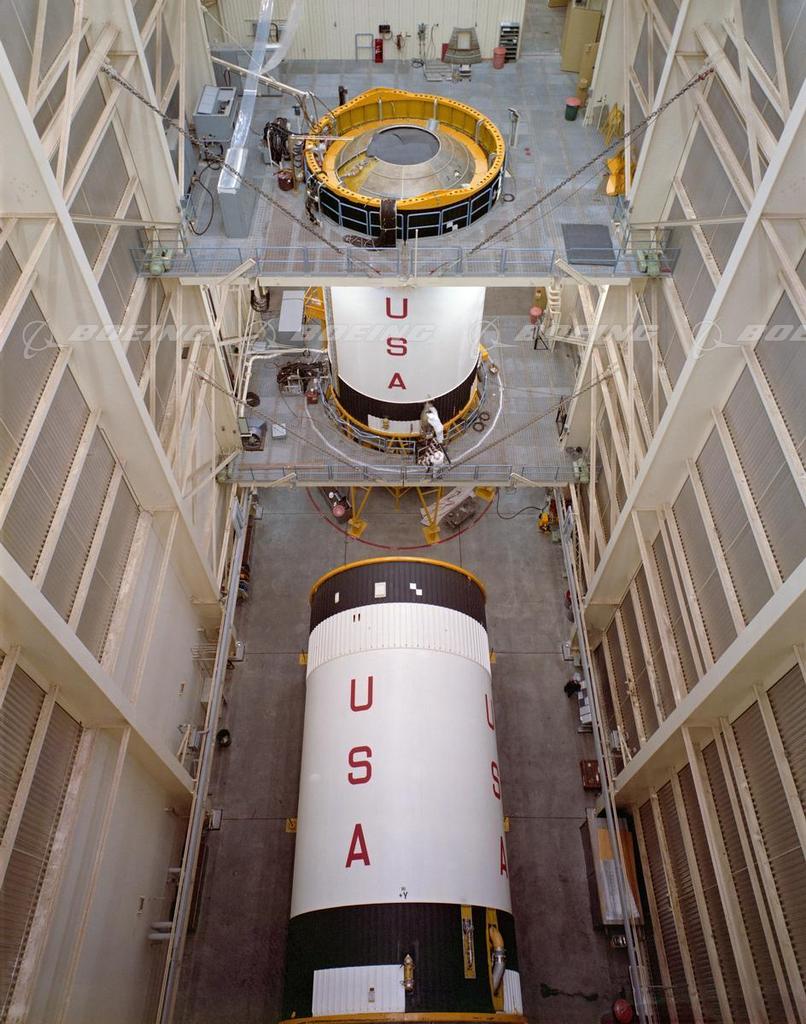 In 1961 NASA contracted Boeing to build the 138-foot, 300,000-pound S-1C boosters that were the first stage of the 363-foot Apollo/Saturn V launch vehicles that would blast Apollo capsules to the moon. The first-stage booster, designed by Boeing in Huntsville, Ala., and assembled in New Orleans, La., had 7.5 million pounds of thrust and was a quantum leap beyond other rockets of the time. Its task was to hurl a 120-ton payload into orbit around the Earth. North American Rockwell built the S-II second stage, the command and service modules, and the F-1 and J-2 rocket engines, and the McDonnell Douglas Corp. built the S-IVB third stage. As time went on, Boeing was given more responsibility for the Saturn V program and, by 1964, was in charge of assembling all three stages of the rocket and providing mission support. Boeing also provided the technical staff at Cape Kennedy, responsible for checkout support during final assembly.