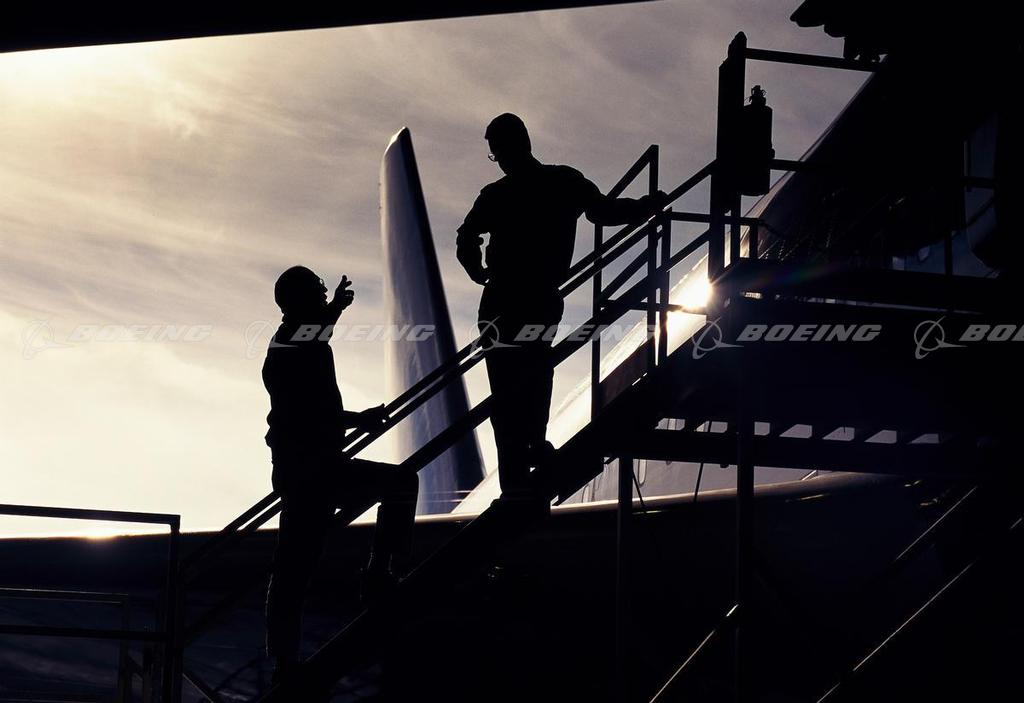 Silhouetted 747 Jet Engine Maintenance Crew at Sunset