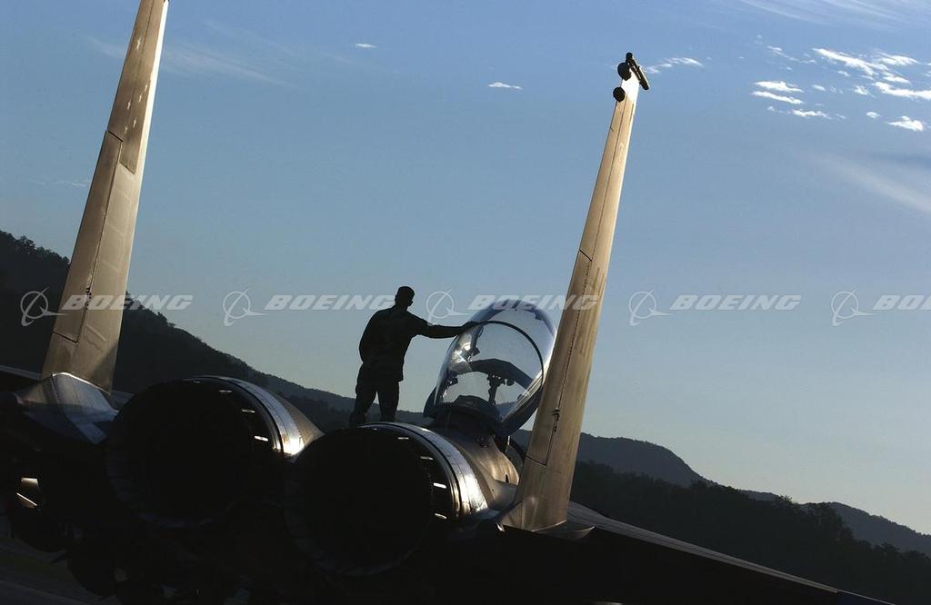 Silhouetted Figure Standing by F-15E Strike Eagle Cockpit