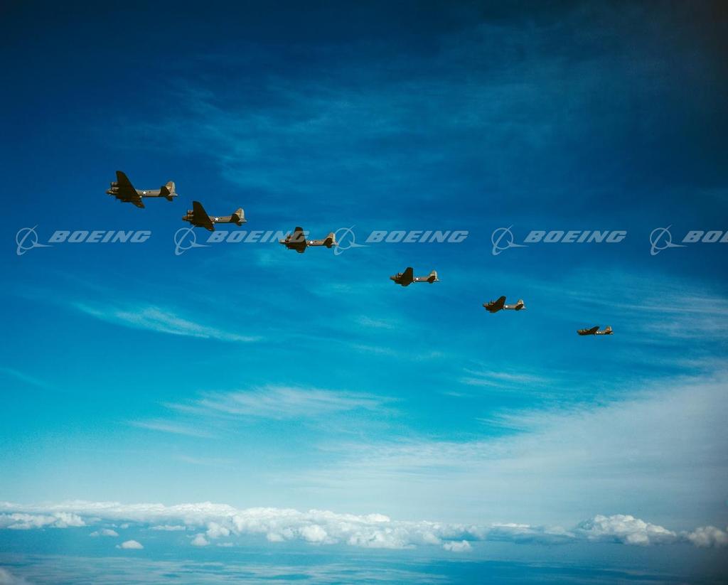 As the storm of World War II shook the world, Boeing-designed B-17 bombers darkened European skies, dropping 640,036 bombs on designated targets. Described by General H. H. Hap Arnold, as the backbone of our worldwide aerial offensive, the B-17 Flying Fortress served in every World War II combat zone. Boeing, Douglas, and Lockheed Vega produced 12,731 B-17s at plants across the country, and the four-engine bombers became legendary for their ability to stay in the air after taking brutal poundings.