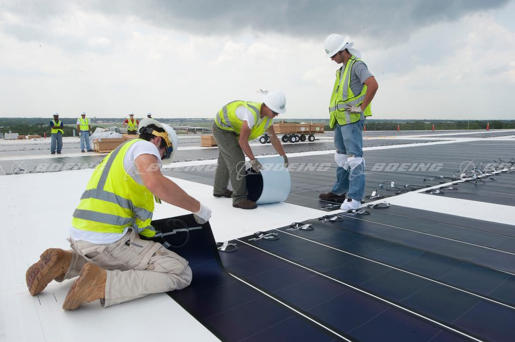 Workers install the more than 10 acres of thin-film laminate solar panels on the roof of the Boeing South Carolina 787 Final Assembly building in North Charleston, S.C.