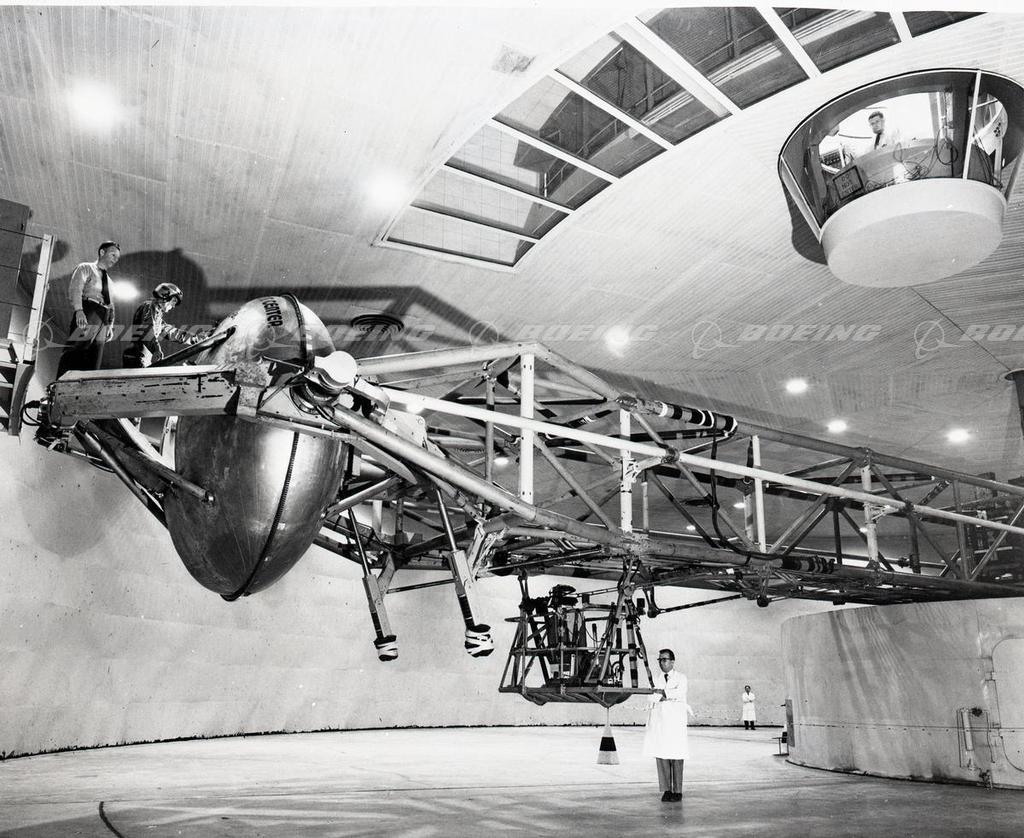 North American Aviation test pilot Scott Crossfield testing a new space suit in the centrifuge at the Naval Air Development Center in Johnsville, Pennyslyvannia, December 17, 1957. Testing was done in preparation for testing the X-15 research airplane.