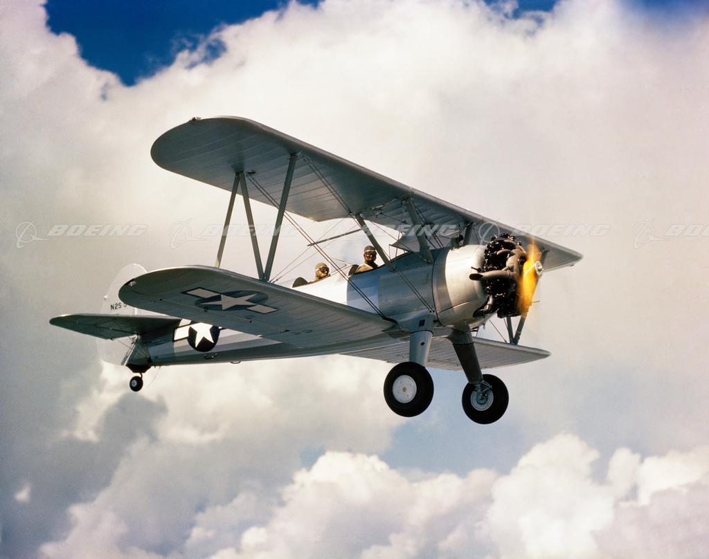 The Kaydet, the two-seater biplane introduced by Stearman Aircraft Division of Boeing in Wichita, KA, in 1934, became an unexpected success during World War II. Despite its almost obsolete design, its simple, rugged construction made it ideal as a trainer for novice pilots for the U.S. Army Air Corps (PT-13/-17) and U.S. Navy (NS/N2S). The Kaydets had fabric-covered wooden wings, single-leg landing gear, an over-built welded-steel fuselage, and radial engines. Between 1936 and 1944, Boeing built 8,584 Kaydets, in all versions, plus the equivalent of 2,000 more in spares.