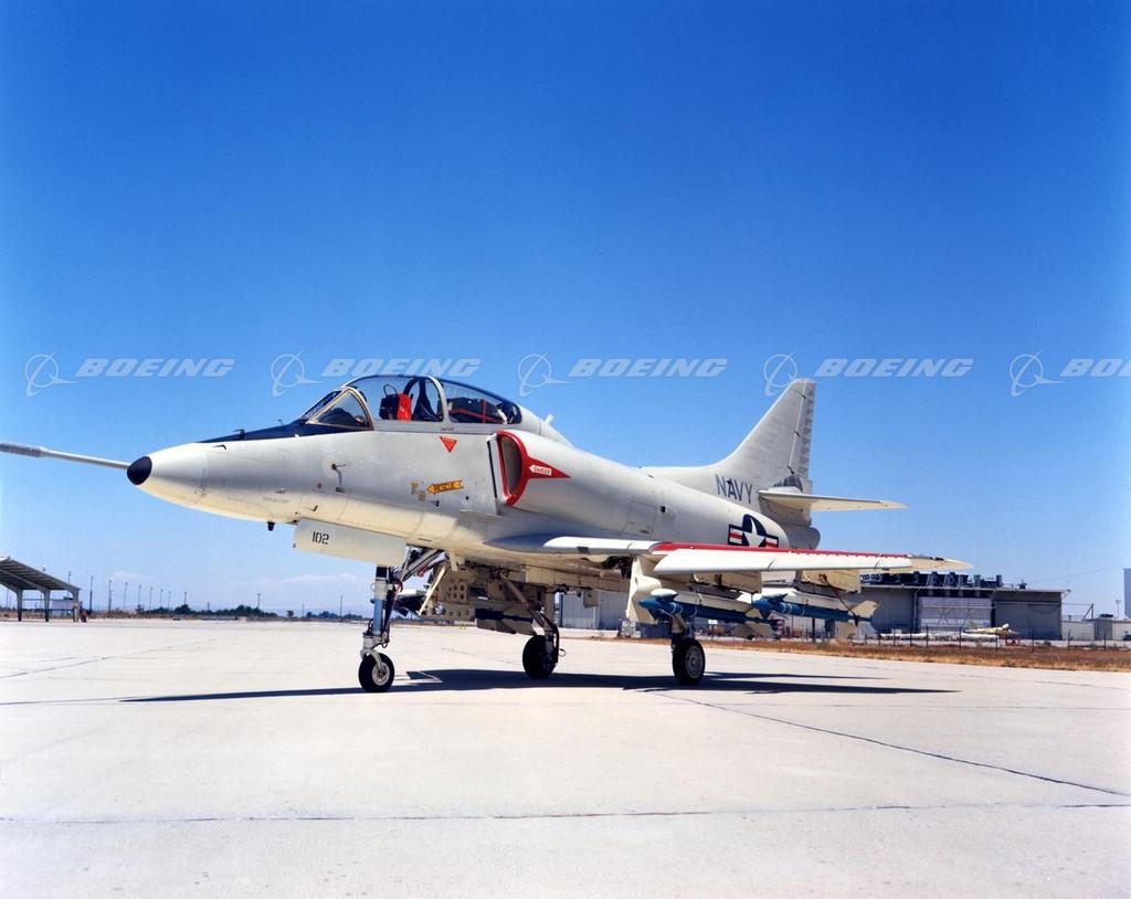 Douglas built 2,960 Skyhawks between 1954 and 1979. Built small to be cost effective and so that more could be accommodated on a carrier, the lightweight, high-speed bombers provided the U.S. Navy and Marines and friendly nations with maneuverable, yet powerful, attack bombers that had great altitude and range capabilities, plus an unusual flexibility in armament capacity. Two-seat trainer versions included the TA-4F (pictured here), TA-4J and the TA-4K Series.