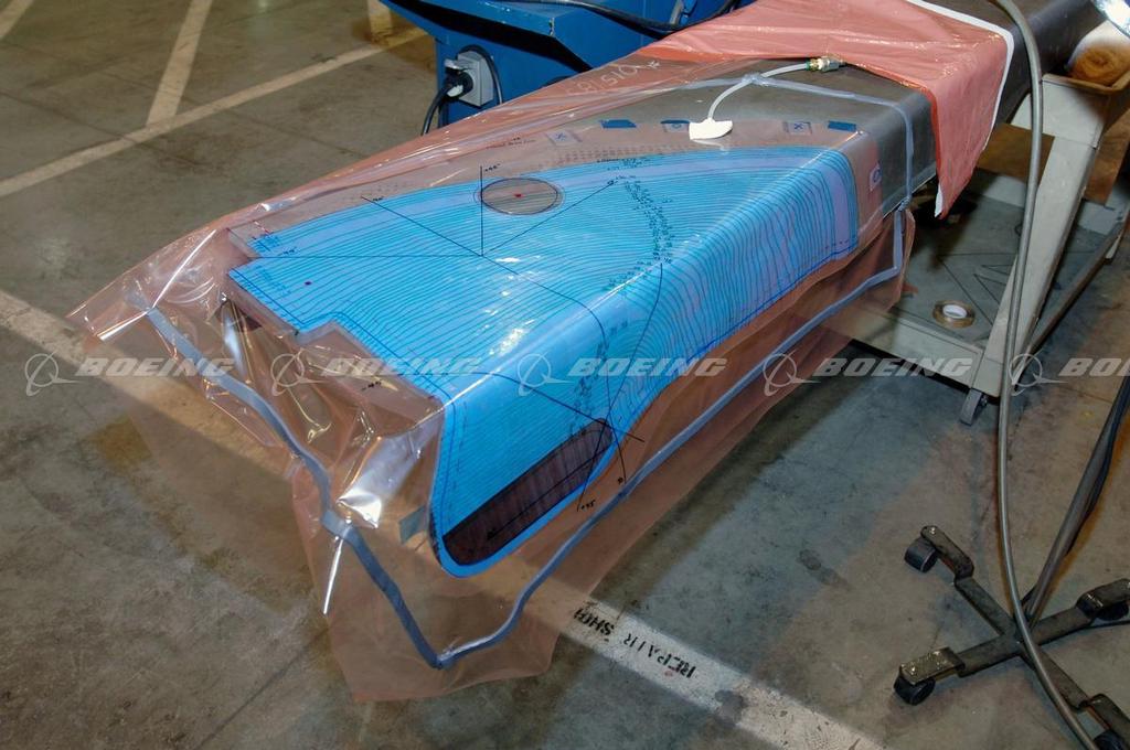 A template for a composite repair is marked for vacuum bagging at the Boeing composites manufacturing facility in Frederickson, Washington.