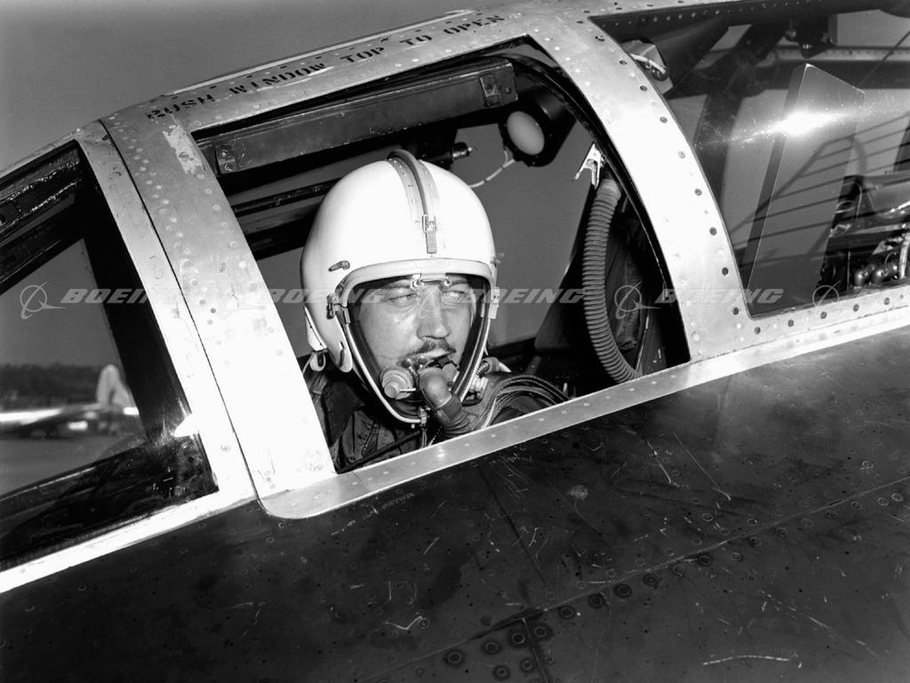 Legendary Boeing test pilot A. M. "Tex" Johnston in the cockpit of the YB-52. Johnston made a name for himself when he rolled the prototype 707 jetliner -- not once, but twice on its initial public display.