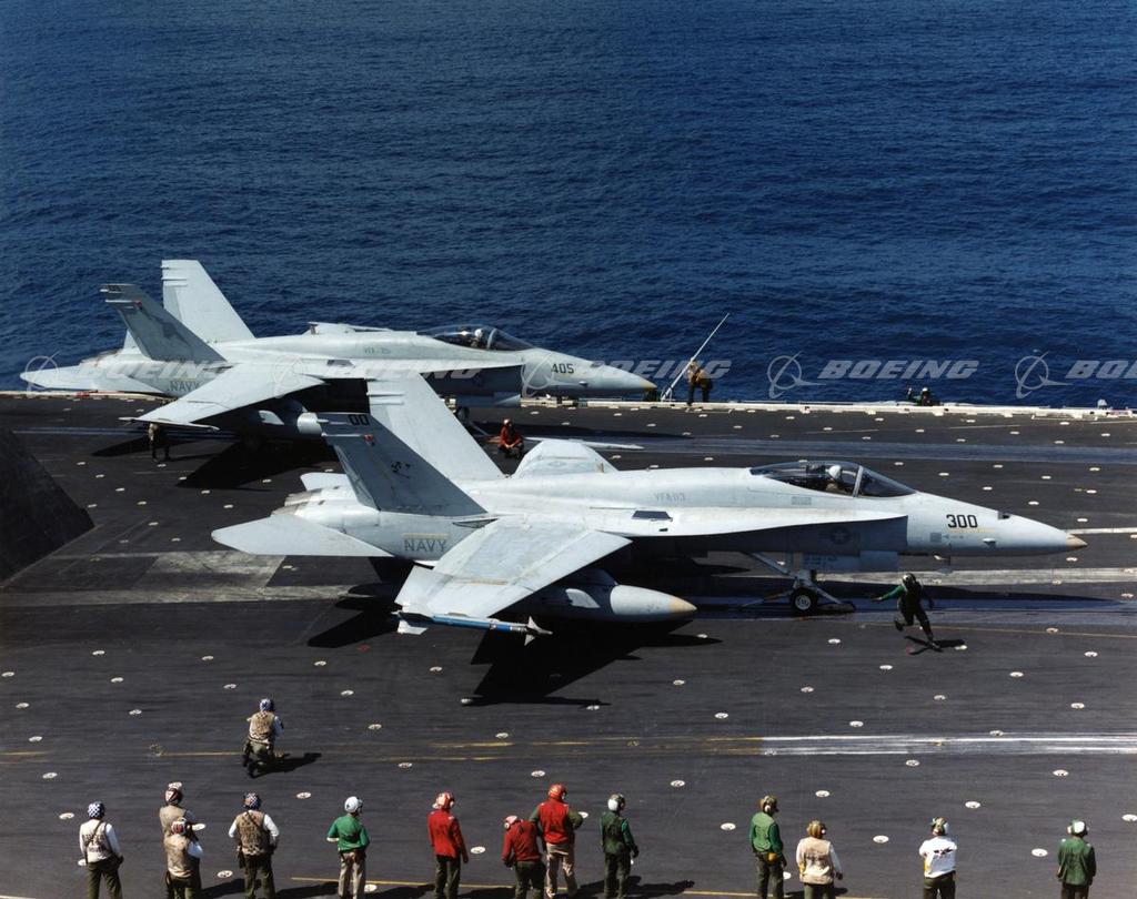 Two F/A-18C/D Hornets on Aircraft Carrier Deck