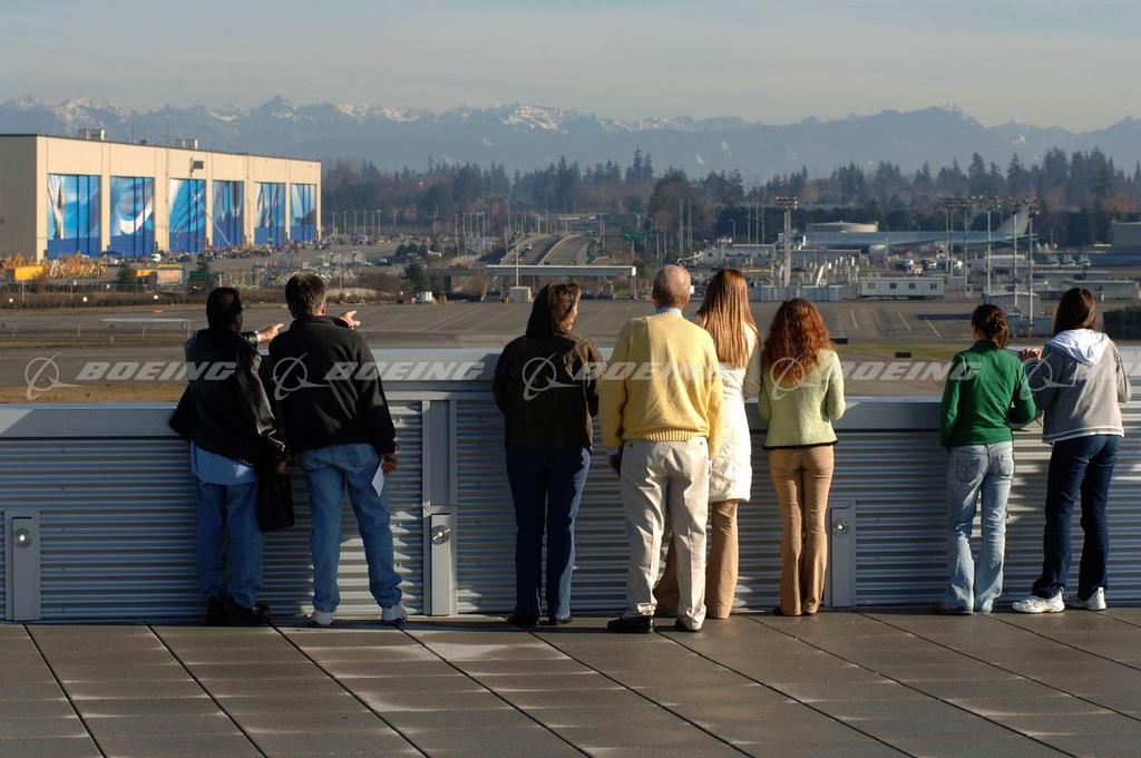 Visitors on the Future of Flight and Boeing Tour Observe the Factory from a Rooftop Balcony