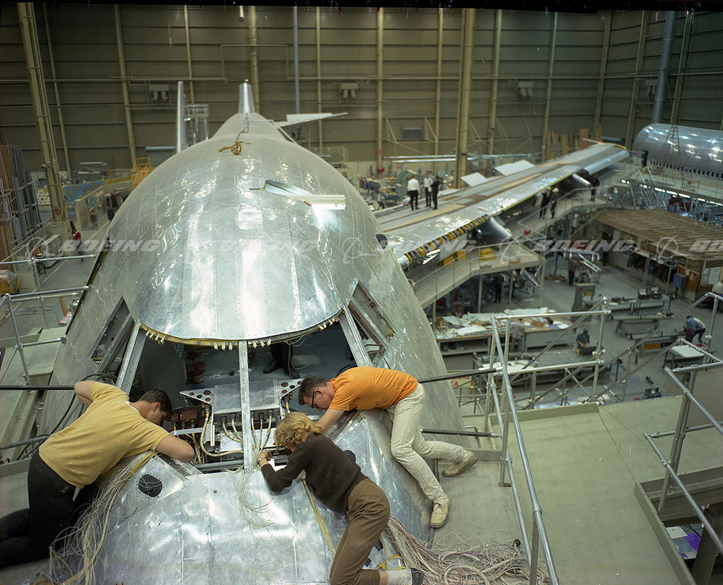 Wiring the cockpit instruments of a Boeing 747 mockup circa 1967