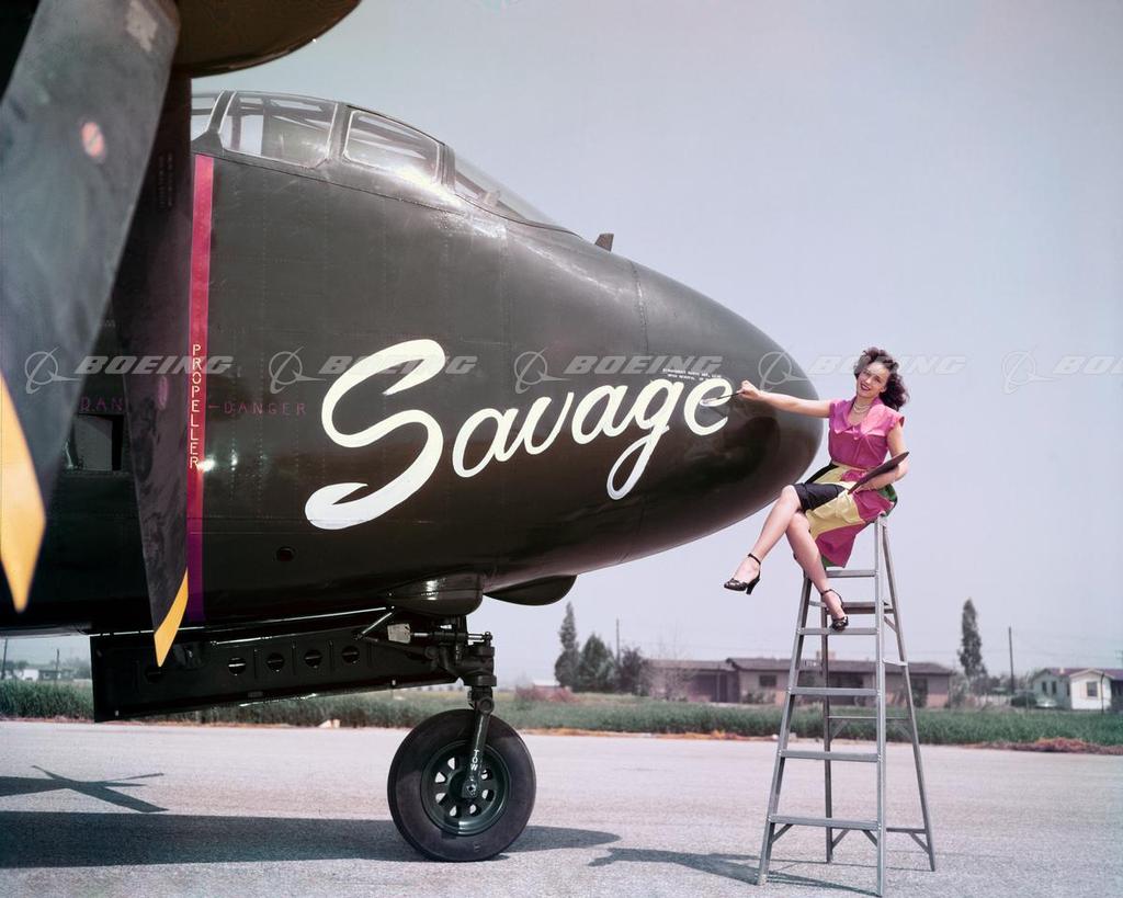 Ladies Gather Around a B-25 Mitchell with Thunderbird Nose Art