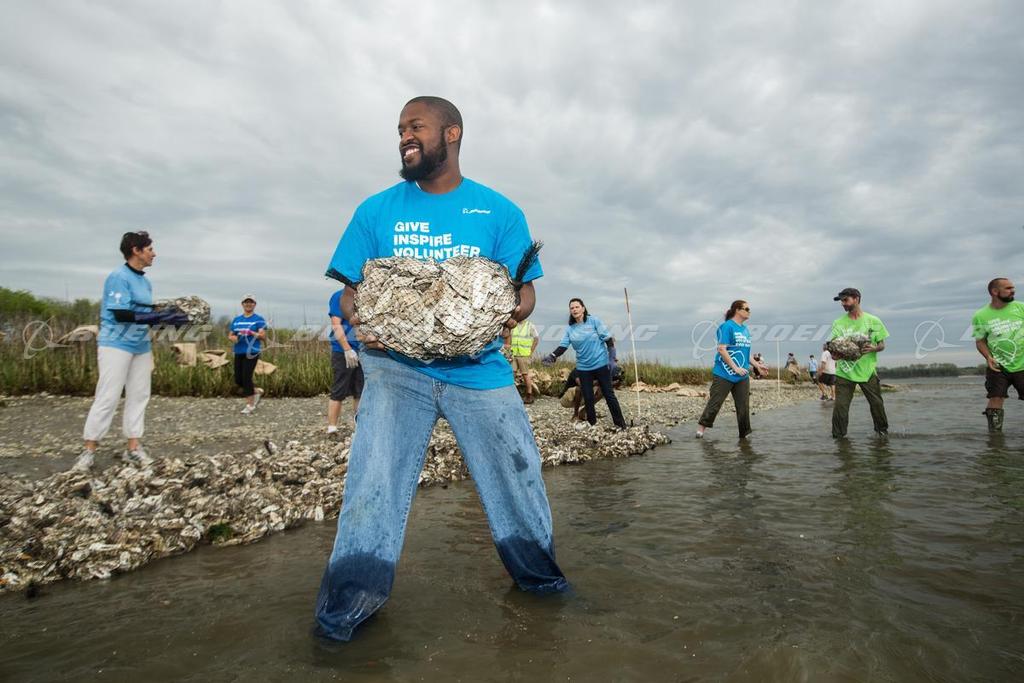 Boeing South Carolina teammates help construct an oyster reef as part of a community project with Wounded Nature.