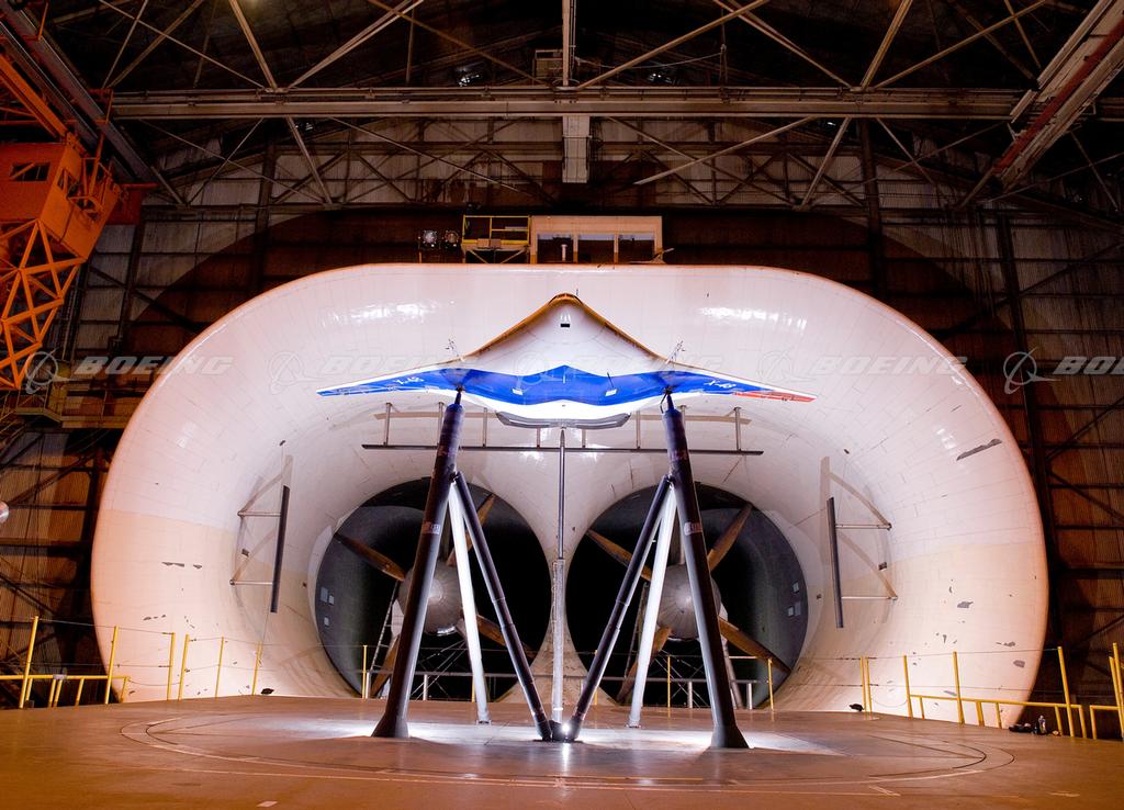 A modified version of the Boeing X-48B blended wing body demonstrator, given its own X-plane designation by the U.S. Air Force as the X-48C, completed a 300-hour wind-tunnel test program at the NASA Langley Research Center in Virginia in September 2009. With a 21-foot wingspan, the 500-pound X-48 airplanes are 8.5 percent scale models of a heavy-lift, subsonic airplane with a 240-foot wingspan that the Boeing Phantom Works organization believes could be developed in the next 15 to 20 years for military cargo applications. In large part because of the way the engines are integrated into the vehicle - on top of instead of underneath of the wings - the BWB (Blended Wing Body) concept offers the potential to be quieter.