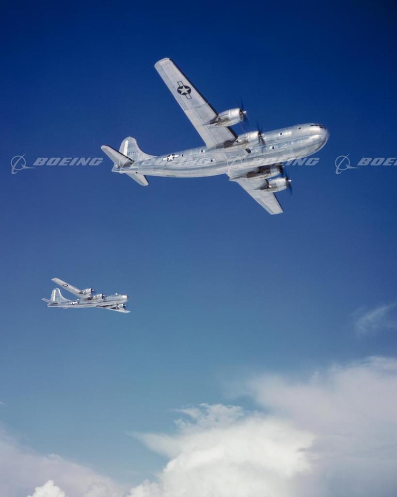 The C-97 Stratofreighter (Model 367) was the high-flying cargo and transport plane that evolved from the B-29 bomber. The pressurized Model 367s had a double-lobe fuselage consisting of two intersecting circular sections so its 74-foot-long upper deck had the larger diameter. Cargo was loaded through large clamshell doors in the belly using a built-in ramp and a hoist. In addition to five crew members, the C-97 Stratofreighter could carry 134 troops or 83 stretcher patients with four attendants.