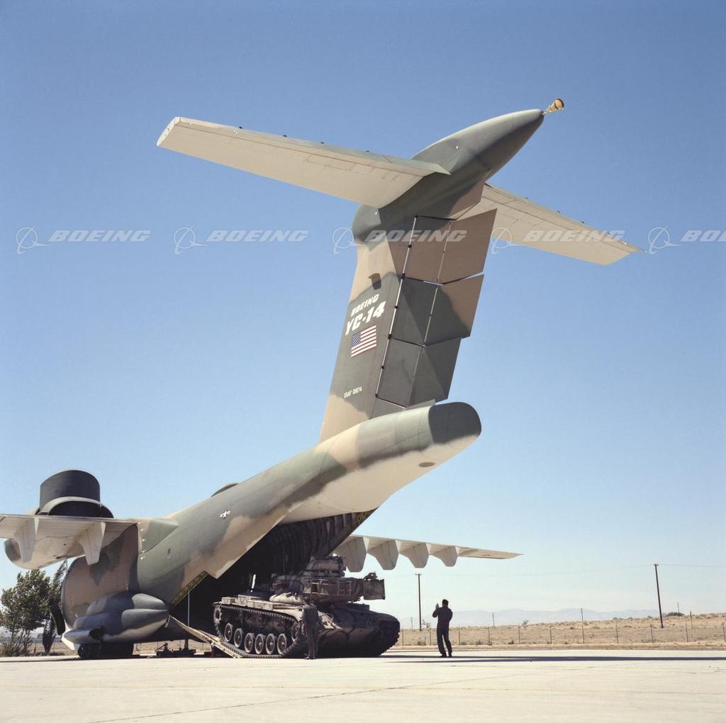 The YC-14 was built to carry troops and equipment into battle zones with short, temporary airfields. Cargo and wheeled vehicles could be loaded into the wide fuselage via a built-in tail ramp. Although the YC-14 never went into production, its two prototypes, built in 1976, introduced significant technological breakthroughs, most notably an upper-surface-blowing (USB) design for high aerodynamic lift. The achievements of the YC-14 contributed in a significant way to advance studies of STOL technology.
