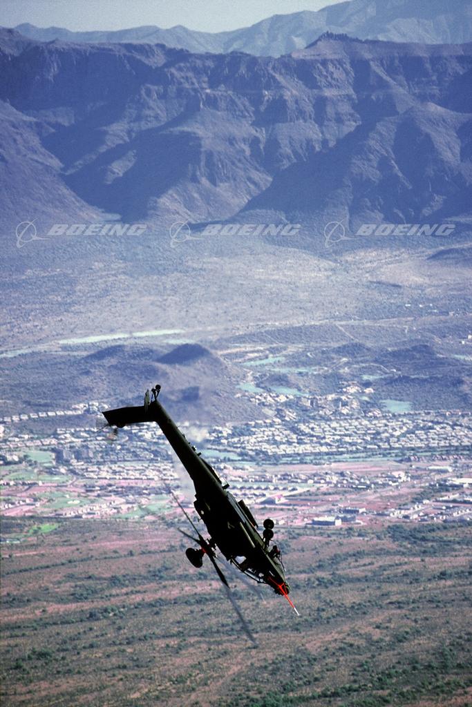 The AH-64D Apache Longbow can perform loops, left and right rolls and turns, split S and hammerhead maneuvers, and 360 degree turns, all while flying at full mission weight of approximately 16,000 pounds.