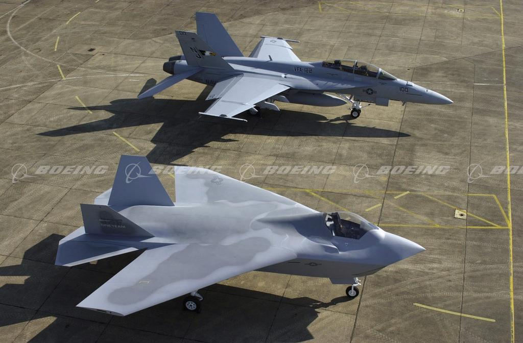 The airplanes the U.S. Navy will take into battle for years to come are on display this week at the Farnborough International 2000 airshow near London. The Boeing Joint Strike Fighter full-scale model (foreground) stands shoulder-to-shoulder with the Boeing F/A-18E/F Super Hornet, as the aircraft will appear on the Navy's aircraft carriers. Boeing is currently competing to build the JSF, with a winner to be selected during 2001. The Super Hornet is in production, and the company and the Navy recently signed an $8.9 billion multi-year contract for 222 aircraft.