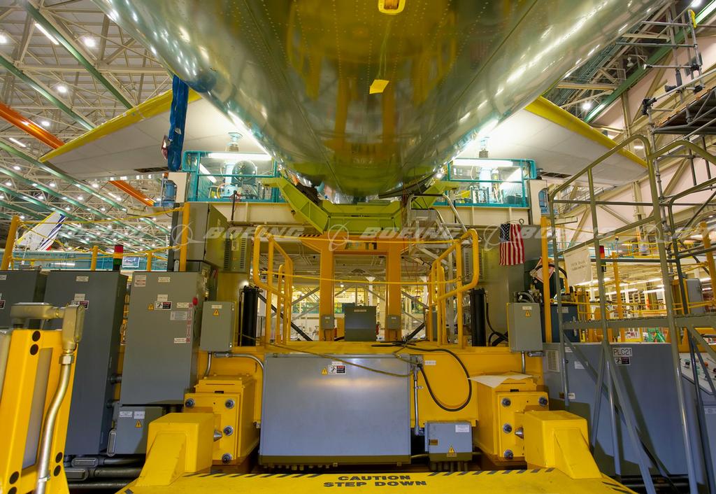 In 2006 Boeing began using a moving assembly line for the first time to build its market-leading 777 jetliner. At first, the moving assembly line was used only during final assembly positions for the airplane, moving it at a steady pace of 1.6 inches per minute during production. To make its 777 assembly line move during final assembly, a tug is attached around the front landing gear of the airplane and pulls it forward. The tug has an optical sensor that follows a white line along the floor. A continuous, one-bay moving assembly line for the 777, which will include systems installation, final body join and final assembly for the airplane, is scheduled for sometime in 2008. This will be the most extensive moving production line used to build a commercial airplane.