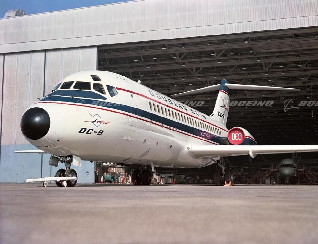 Douglas DC-9 (1965-1982): The DC-9 jetliner was designed to serve smaller airports and shorter routes than those served by the larger Boeing 727. It was developed to be a jet-age DC-3, bringing reliable jet service to any airport in the world. Smaller than the DC-8, the baseline DC-9 carried fewer passengers than some versions of the propeller driven DC-6 and DC-7 airliners. The DC-9 made its first flight on February 25, 1965, and entered service with Delta Airlines just 10 months later. It quickly became one of the most popular airlines ever built. In addition, the U.S. military ordered specially modified versions of the DC-9. The C-9A Nightingale was used by the Air Force to transport sick and injured military personnel. The Navy and Marine Corps flew the C-9B Skytrain II. Three executive transport versions were delivered to the Air Force as the VC-9C. With 976 aircraft produced in eight variations, the DC-9 ended its 17 year production run in 1982. Today, more than 800 DC-9s are still flying.