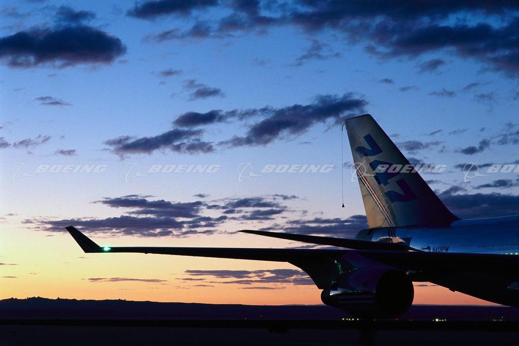 Silhouetted 747-400 Wingtip and Tail at Sunset