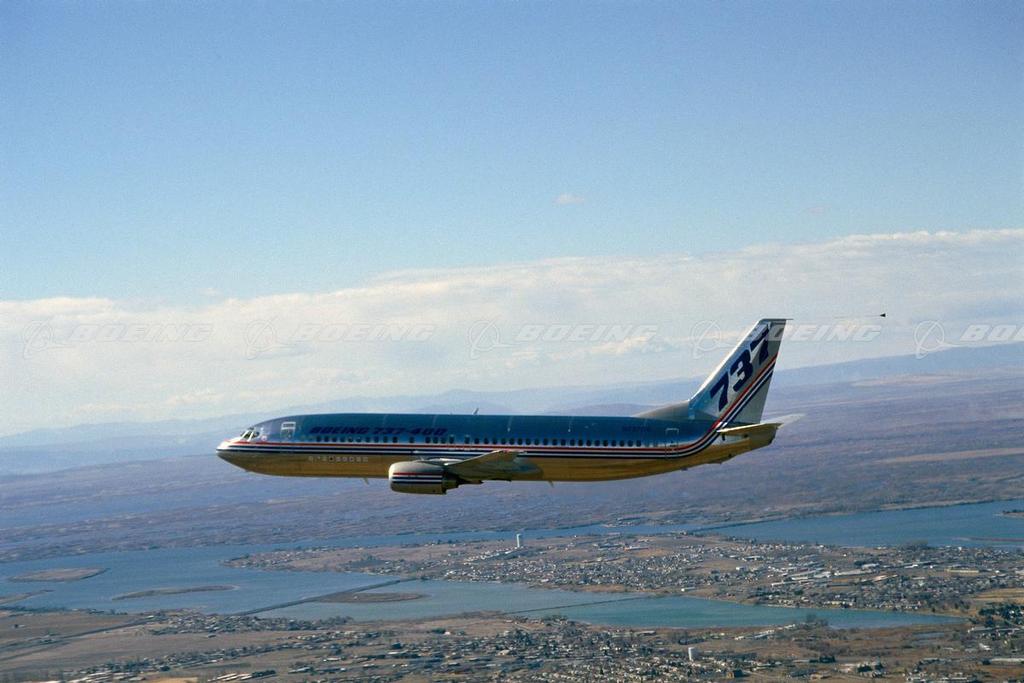 Development of the quieter, more fuel-efficient CFM56-3 series of engines allowed Boeing to improve its most popular jetliners and produce the advanced-technology 737-330, -400, and -500. The engines are larger and mounted forward of the wing struts instead of tucked directly under the wing as in the -100 and -200 versions. Advancements on the new-generation 737s included a stregthened wing to accomodate greater gross weight, tip extensions to the wings and horizontal stabilizers, and stregthened wheels, tires and brakes. The 737-200, -300, -400, -500 have the same handling characteristics so that pilots can use the same Type rating to fly all of them. Airlines' spares inventory and maintenance are simplified by making a substantial number of replaceable parts on the -300, -400, -500 identical to those used on the -200. The 737-400 is about 10 feet longer than the 737-300. It holds 19 more passengers and has a gross weight of up to 150,000 pounds, while retaining the same fuel efficiency, low noise, and low operating costs as its predecessor.
