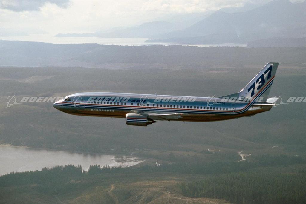 Development of the quieter, more fuel-efficient CFM56-3 series of engines allowed Boeing to improve its most popular jetliners and produce the advanced-technology 737-330, -400, and -500. The engines are larger and mounted forward of the wing struts instead of tucked directly under the wing as in the -100 and -200 versions. Advancements on the new-generation 737s included a stregthened wing to accomodate greater gross weight, tip extensions to the wings and horizontal stabilizers, and stregthened wheels, tires and brakes. The 737-200, -300, -400, -500 have the same handling characteristics so that pilots can use the same Type rating to fly all of them. Airlines' spares inventory and maintenance are simplified by making a substantial number of replaceable parts on the -300, -400, -500 identical to those used on the -200. The 737-400 is about 10 feet longer than the 737-300. It holds 19 more passengers and has a gross weight of up to 150,000 pounds, while retaining the same fuel efficiency, low noise, and low operating costs as its predecessor.