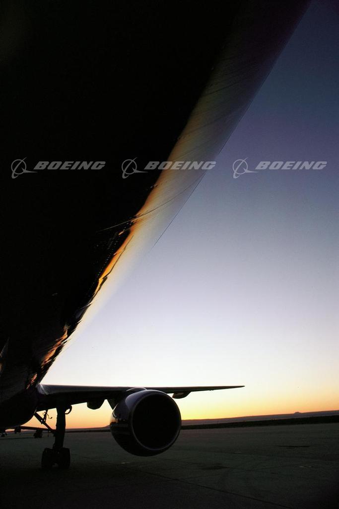 Underbelly of a Boeing 757 on Tarmac at Sunset