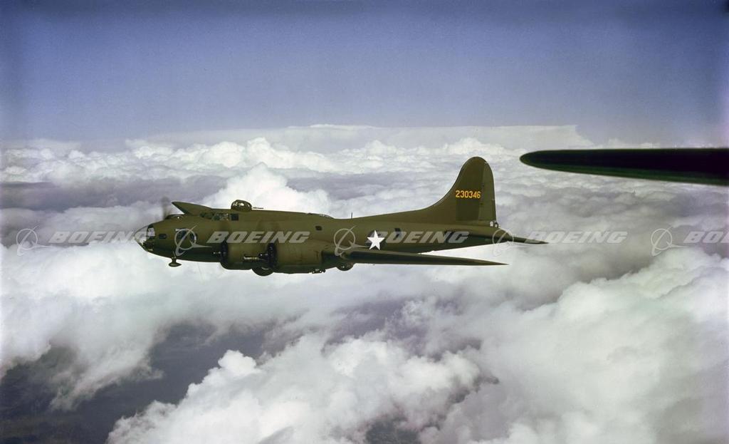 The B-17F, distinguished by its molded plexiglass nose assembly and wide paddle-blade propellers, could fly farther than earlier versions of the B-17 because of 1,000 gallons of additional fuel stored in self-healing tanks. Under the Boeing-Douglas-Vega nationwide, collaborative production effort, Boeing built 2,300 B-17Fs; Douglas, 600; and Lockheed (Vega), 500.