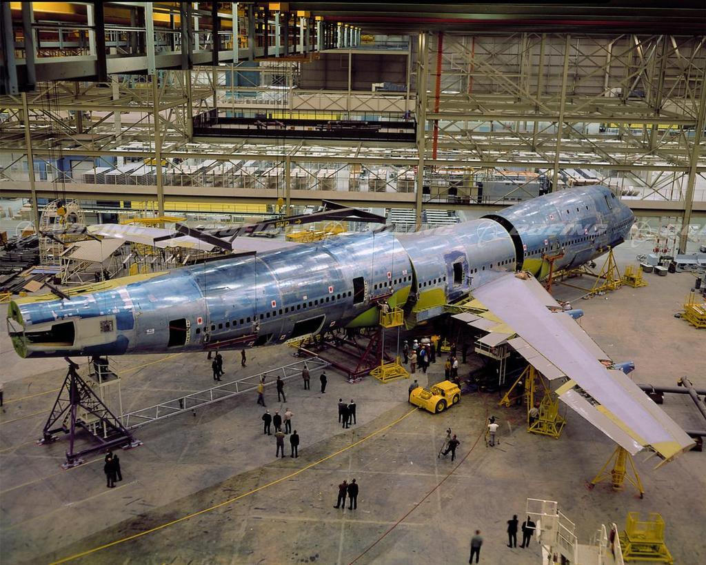 The 747 was truly monumental in size. The massive airplane required construction of the 200-million-cubic-foot 747 assembly plant in Everett, WA., the world's largest building (by volume). The fuselage of the original 747 was 225 feet long; the tail as tall as a six-story building. Pressurized, it carried a ton of air. The cargo hold had room for 3,400 pieces of baggage and could be unloaded in seven minutes. The total wing area was larger than a basketball court. Yet, the entire global navigation system weighed less than a modern laptop computer.