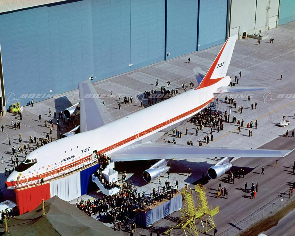 Boeing rolled out the first 747-100 from the Everett, WA factory on Sept. 30, 1968. The Boeing 747 was the world's first jumbo jet--doubling the size of the 707. Since 1970, the Boeing 747 has been produced in more than 20 versions, including freighter, convertibles, combis and special-use models. Known as the "Queen of the Skies," the 747 is the most recognized airplane in the world.