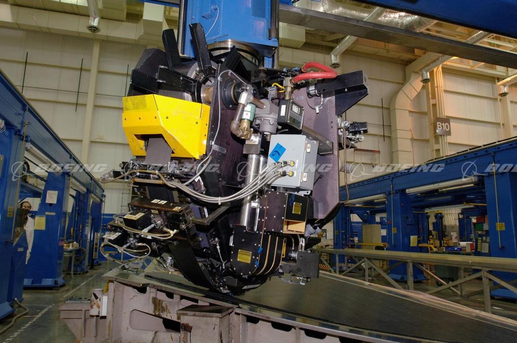 A robotic head assembly on an automatic tape lay-up machine is used to precisely lay carbon fiber ply layers on 777 vertical fin composite panels at the Boeing composites manufacturing facility in Frederickson, Washington.