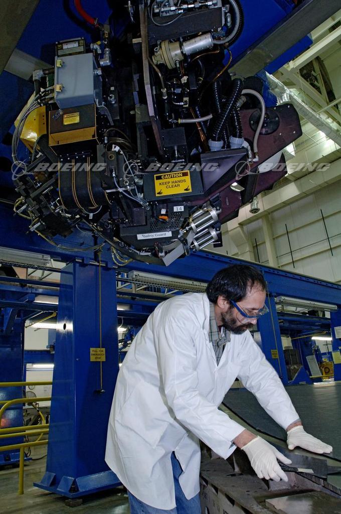 A Manufacturing Technician inspects a carbon fiber composite panel beneath the robotic head of an automatic tape lay-up machine at the Boeing composites manufacturing facility in Frederickson, Washington