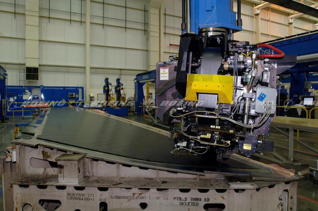 A robotic head assembly on an automatic tape lay-up machine is used to precisely lay carbon fiber ply layers on 777 vertical fin composite panels at the Boeing composites manufacturing facility in Frederickson, Washington.
