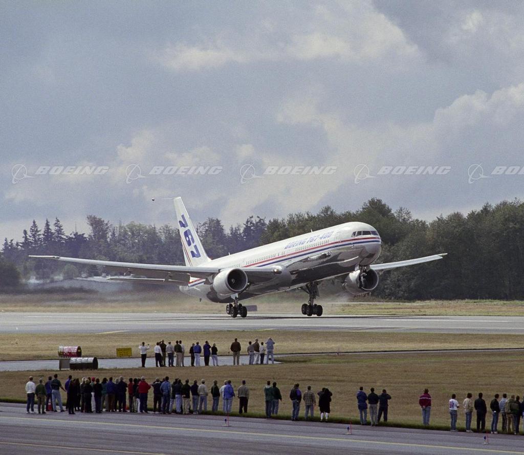 The new 767-400ER (extended range) takes off on its first flight from Paine Field in Everett, Wash. First flight formally launches the airplane's flight-test program, a rigorous series of evaluations to thoroughly test the airplane. The 767-400ER is a longer version of the 767-300ER, featuring additional wingspan, an updated flight deck, new interior and new landing gear. The first 767-400ER was May 2000.