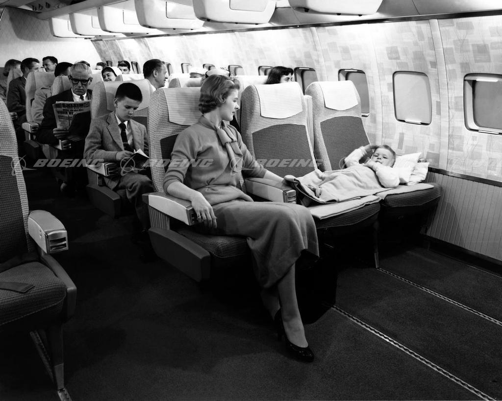 In 1958, the 707 introduced comfort-enhancing cabin features that set the industry standard. Innovations included folding armrests, opaque plastic window shades, and cantilevered seats supported by just two sets of legs for easier access and underseat stowage of carry-on articles.