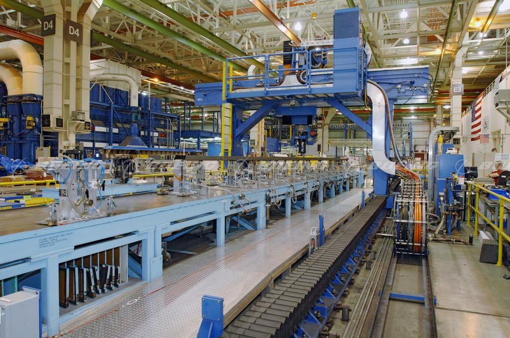 An automated precision drilling system is used for drilling composite parts at the Boeing facility in Frederickson, Washington.