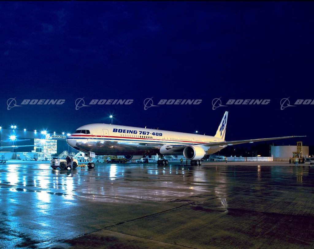 Freshly painted in its Boeing livery, the newest 767 jetliner pauses at sunset outside the paint hangar at the Boeing facility in Everett, Wash. The 767-400ER (extended range) was formally unveiled today during an employee celebration. The airplane is sized between the 767-300 and 777-200, seating 245 passengers in a typical three-class configuration and 304 in a typical two-class configuration. It is 21 feet longer than the 767-300, and features an upgraded flight deck and all-new interior fashioned after the award-winning 777 cabin. The 767-400ER is scheduled to enter its flight-test program in October of this year. With delivery to launch customer, Delta Air Lines, scheduled in May 2000, the 767-400ER will be the first new jetliner to deliver in the 21st century.