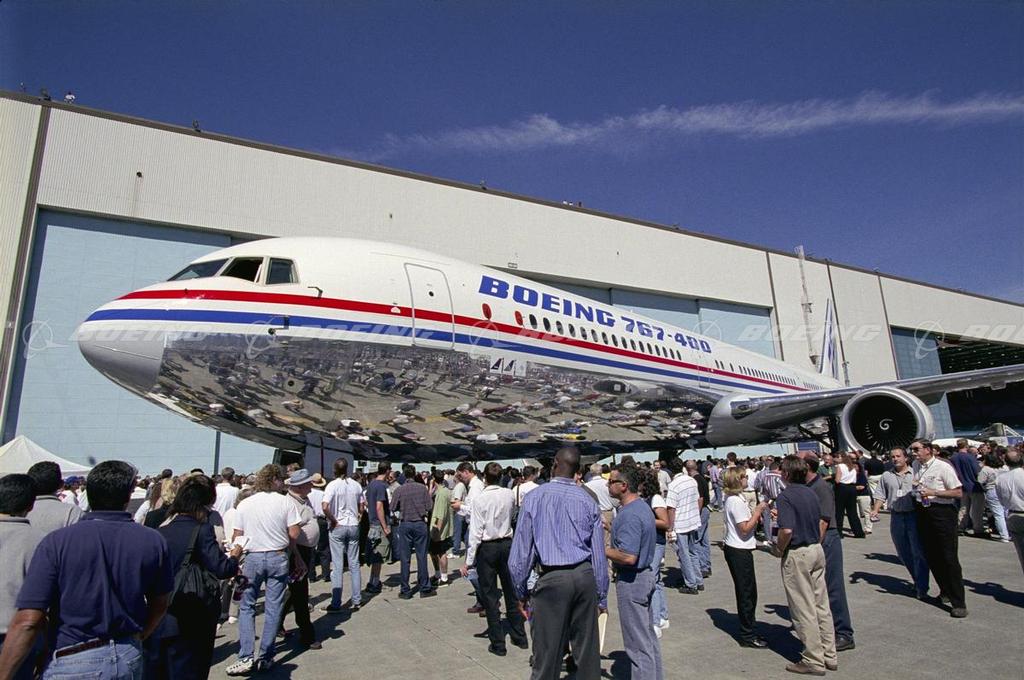 Under sunny skies, employees get a close-up look at the new, 201 foot 767-400ER (extended range) jetliner.
