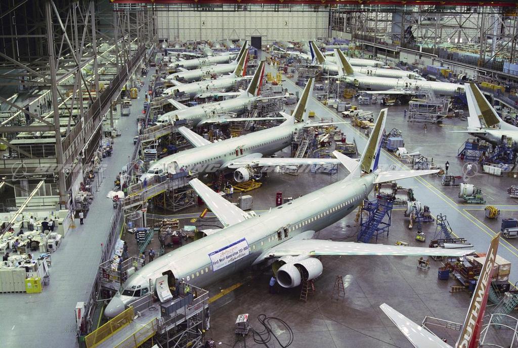 The first Boeing Next-Generation 737-900 jetliner, shown in foreground with banner, moves up the final assembly production line at the busy Boeing 737 factory in Renton, Wash. In 2002 the 737 manufacturing process converted to a moving line system, replacing the station to station method of assembly pictured here.