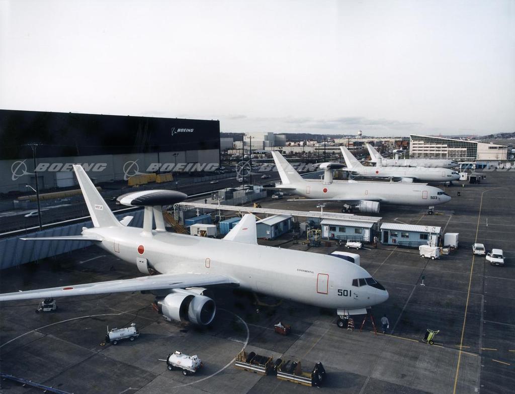 SEATTLE, Feb. 26, 1998 -- The four 767 Airborne Warning and Control System (AWACS) aircraft Boeing will deliver to the government of Japan are parked together for the first time at Boeing Field in Seattle. Aircraft No. 1 (far left) and No. 2 (far right) recently completed flight and mission system testing, and will be delivered March 11. Mission equipment - including display consoles and radar and communication equipment - currently is being installed on aircraft No. 3 (second from left) and No. 4 (third from left). The rotodome will be installed on aircraft No. 4 in early April, and both No. 3 and No. 4 will begin flight test later this year. The second two AWACS will be delivered in early 1999. AWACS, the world's standard for airborne early warning and control systems, fills the need for both airborne surveillance and command and control functions for tactical and air defense forces. There currently are 66 E-3 707 AWACS operating in the United States, the United Kingdom, France, Saudi Arabia and NATO. Production of the 707 airframe ended in 1991, with the 767 platform chosen in replacement.