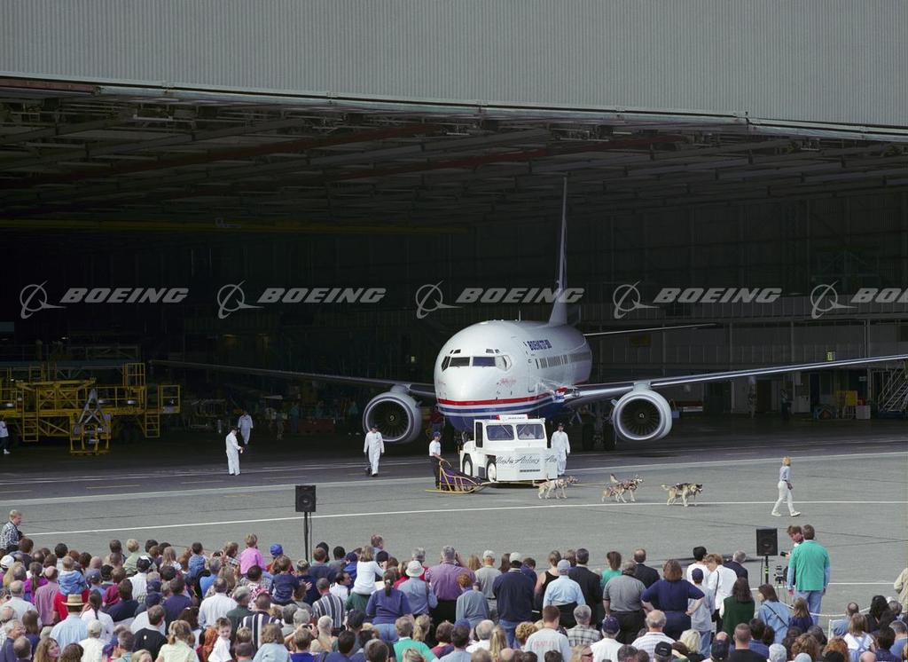 Symbolizing the spirit of launch customer Alaska Airlines, Iditarod sled-dog race champion Doug Swingley and his team escort the first Boeing Next-Generation 737-900 out of the factory for its world premiere. Boeing and Alaska Airlines and employees cheered the airplane at a rollout celebration in Renton, Wash. The Boeing 737-900 is the newest Boeing commercial jetliner and the largest model in the Next-Generation 737 family.